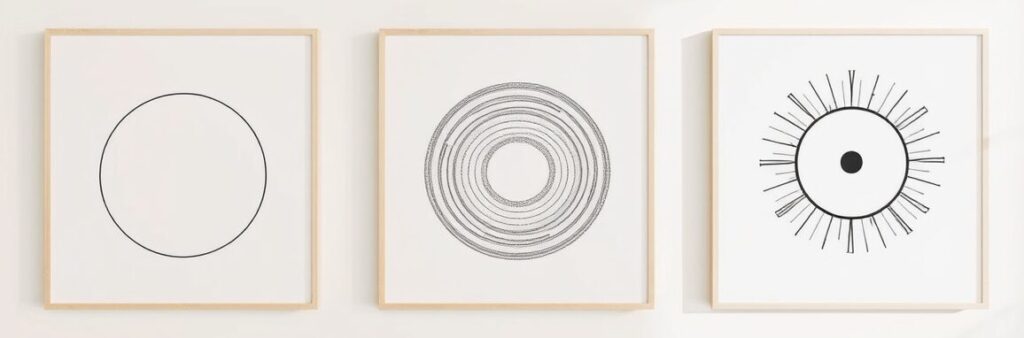 Repeating a shape or symbol throughout your gallery creates a quiet rhythm, for example three different circular designs can create continuity without uniformity.